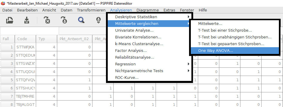 Um die einfaktorielle ANOVA durchzuführen wählen wir im Menü Analysieren -> Mittelwerte vergleichen -> One Way ANOVA