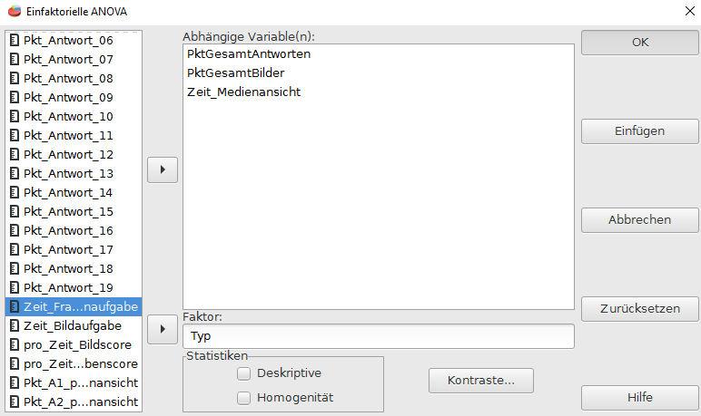 Das Problem ist, dass die Kontrollgruppe zusammen mit den Daten von anderen Medientypen in PSPP eingetragen ist. Die Kontrollgruppe besitzt z. B. in der Realität keine Zeit der Medienansicht, weil kein Medienprodukt angesehen wurde. Unnötigerweise wurde die Medienzeit bei der Kontrollgruppe mit 0 angegeben. Durch die Löschung der Werte - es bleiben Punkte zurück - löst sich das Problem, da die Datensätze nicht in den Test einbezogen werden.