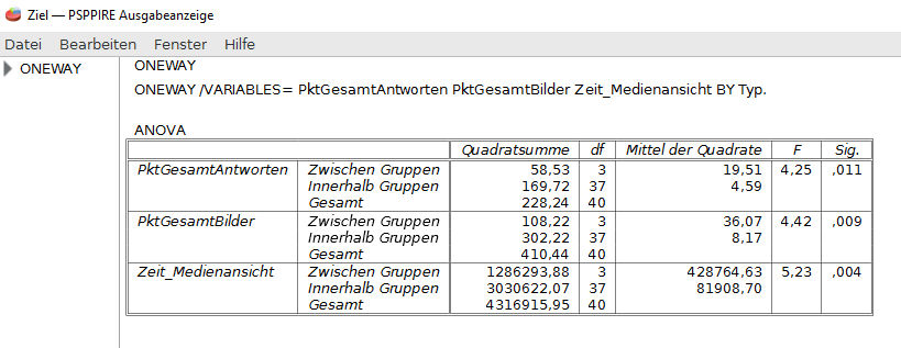 Hier in der Tabelle sehen wir die Ergebnisse des ANOVA. Wir schauen für die abhängige Variable PktGesamtAntworten in die Spalte Zwischen Gruppen. Dort betrachten wir den Signifikanzert genauer, abekürzt als Sig. Der Signifikanzwert liegt unter 0,05. Somit haben wir mindestens signifikante Ergebnisse. Er liegt nicht unter 0,01 somit ist das Ergebnis nicht als hoch signifikant einzustufen. Für die weiteren abhängigen Variablen finden wir hoch und höchst signifikante Zusammenhänge.