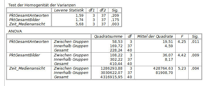 Hier sehen wir nun den Test mit Homogenitätsprüfung. Wir können die ANOVA nur in zwei von drei Fällen einsetzen. Die Werte der ersten beiden abhängigen Variablen sind nicht signifikant, da sie über dem Wert 0,05 liegen. Das bedeutet, die Varianzen sind homogen zwischen den Gruppen und die Voraussetzung für die ANOVA sind erfüllt. Im Fall der abhängigen Variable Zeit_Medienansicht erhalten wir ein höchst signifikantes Ergebnis, wir können auf keinen Fall von einer Varianzhomogenität ausgehen.