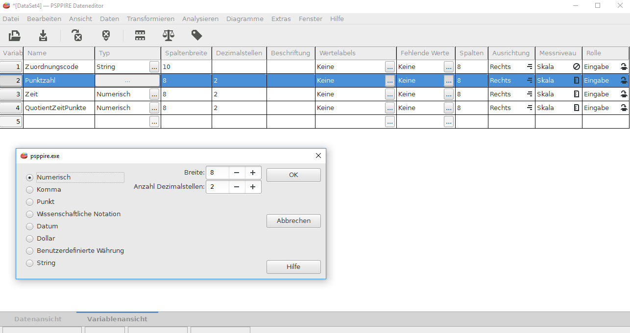 In der Variablenansicht bieten sich uns zahlreiche Optionen um die Variablen dem Anwendungsfall anzupassen. Hier werden nun einige der Dialogfelder gezeigt, damit die Einstellung gelingt.